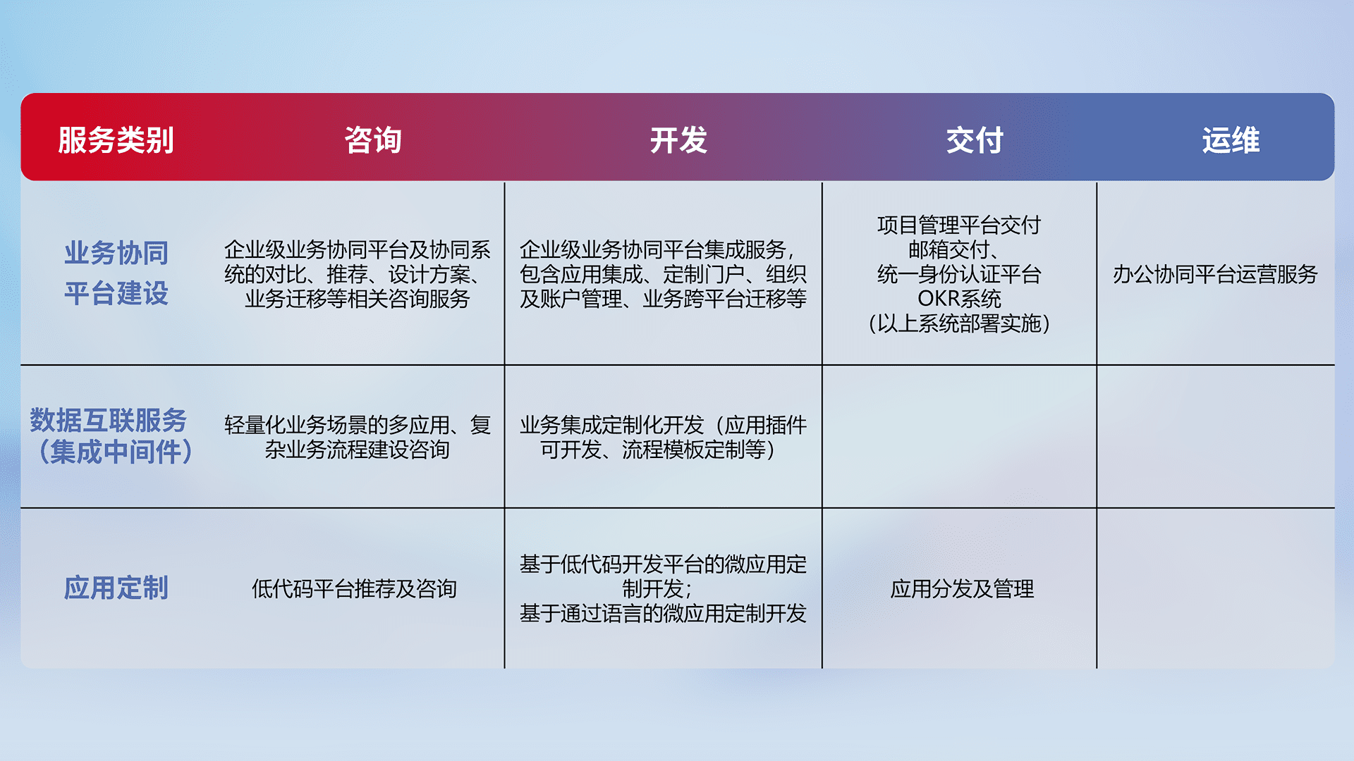 针对钉钉、、、、企微、、、IDaas等平台级产品提供产品的规划、、、、方案、、、、交付、、定制化开发等服务,,,,实现如统一协同办公、、、、智能客户服务、、、混合会议管理、、智能数据查询、、、、等业务场景,,实现数字化转型。。